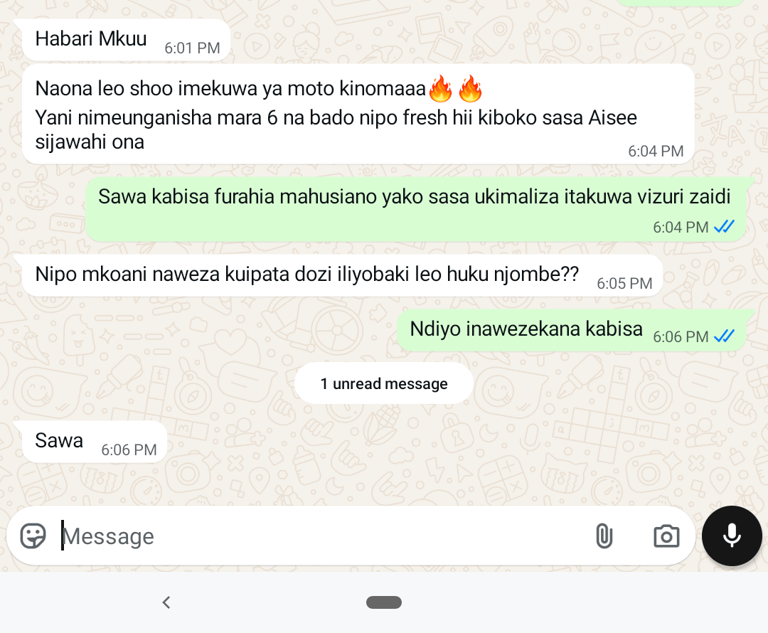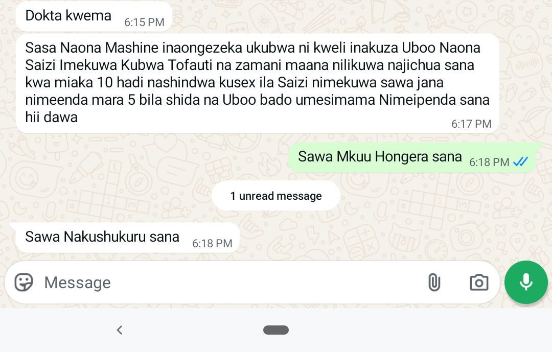 " Nilijaribu dawa na viongeza mbalimbali lakini hakuna kilichonipa matokeo. Nilipoanza kutumia Hii Dawa, nilianza kuona mabadiliko ya haraka. Ndani ya wiki mbili tu, nguvu yangu ilirudi, hofu na wasiwasi vilianza kupungua, na sasa ninaweza kufanya mambo yangu bila hofu wala aibu. Hii si booster tu, ni suluhisho la kudumu ambalo limebadilisha maisha yangu."